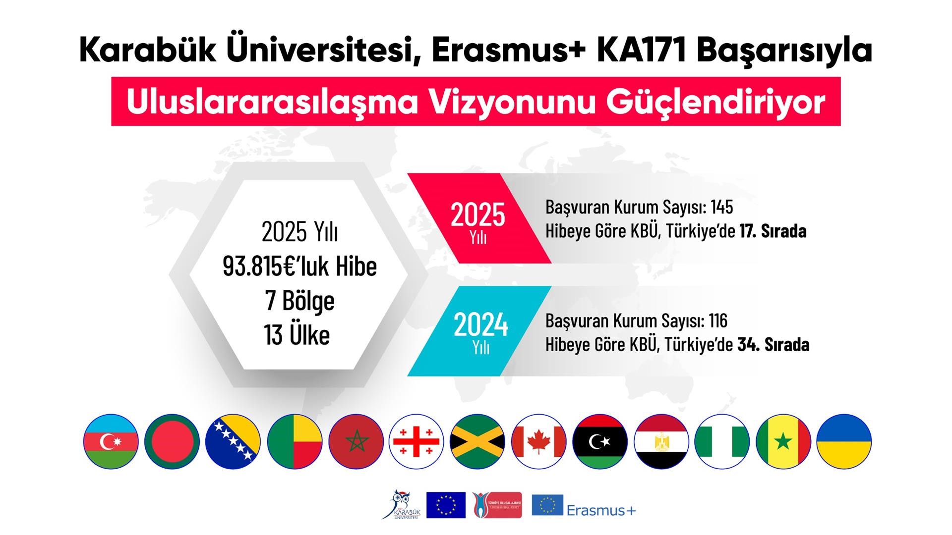 Geçtiğimiz yıl 116 üniversite arasında 34. sırada yer alan KBÜ, bu yılki yükselişiyle uluslararası akademik iş birliği performansını önemli ölçüde artırdı. Erasmus+ KA171 programı kapsamında 2025 dönemi için toplam 93 bin 815 avro hibe almaya hak kazanan üniversite, geçen yıl aldığı 83 bin 819 avroluk hibeyi de geride bırakarak istikrarlı yükselişini sürdürdü.