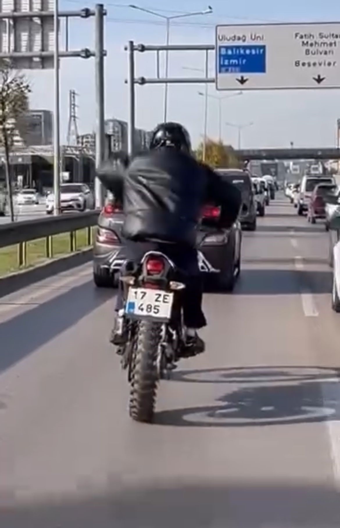 Bursa'da seyir halindeki bir sürücü motosikletini ata biner gibi sürdü. Trafiği tehlikeye düşüren o anlar…